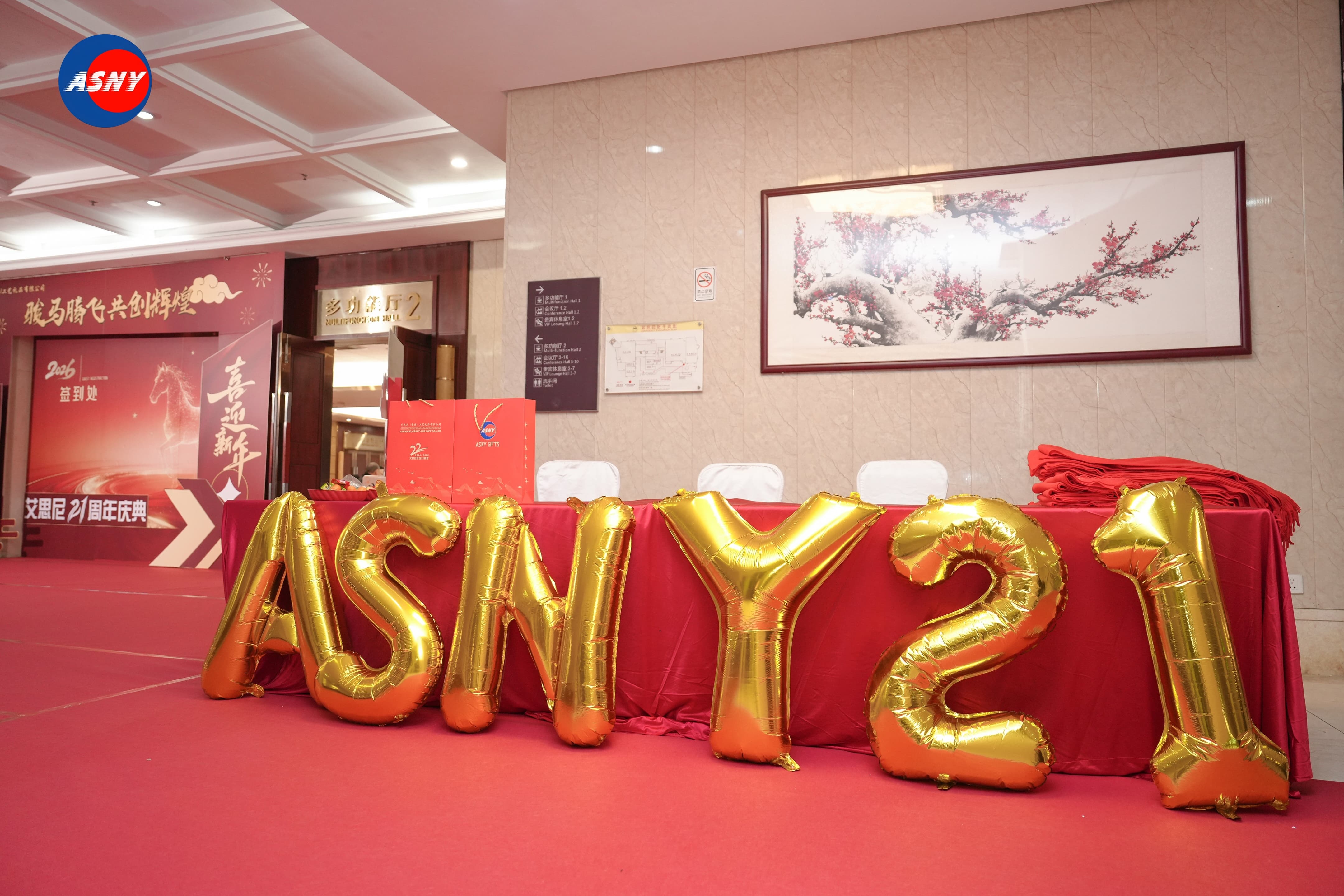 Nearby, a striking “ASNY 21” golden balloon decoration symbolized the company’s 21-year journey of growth. On the tables, neatly arranged red gift bags contained carefully prepared souvenirs for the guests.