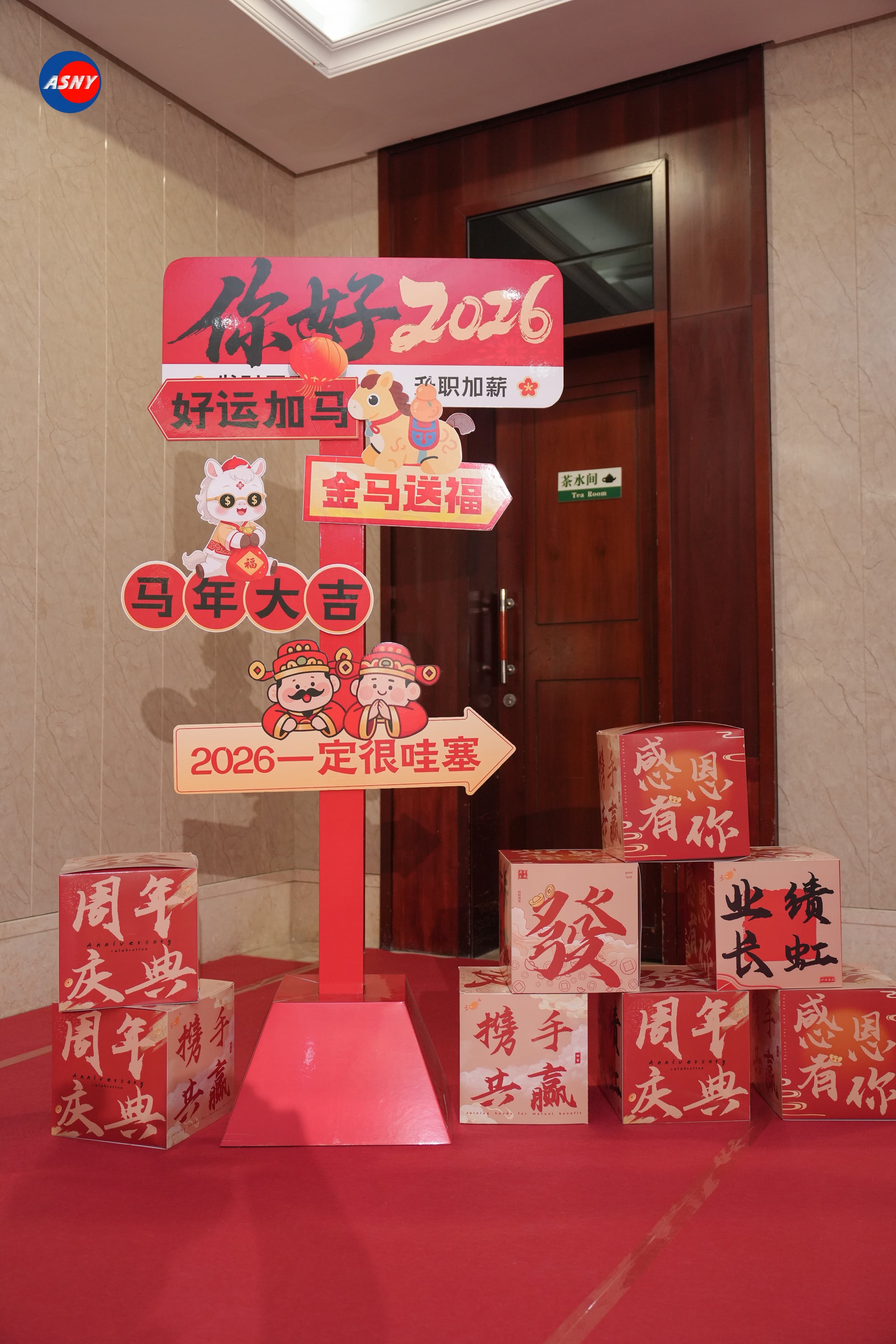 The venue was decorated mainly in bright Chinese red, creating a strong festive atmosphere. At the entrance of the banquet hall, an eye-catching anniversary backdrop immediately drew attention. The design featured a golden horse as the central visual element, together with the theme “Galloping Forward, Creating Brilliance Together,” symbolizing ASNY’s determination to continue moving forward in the coming year.