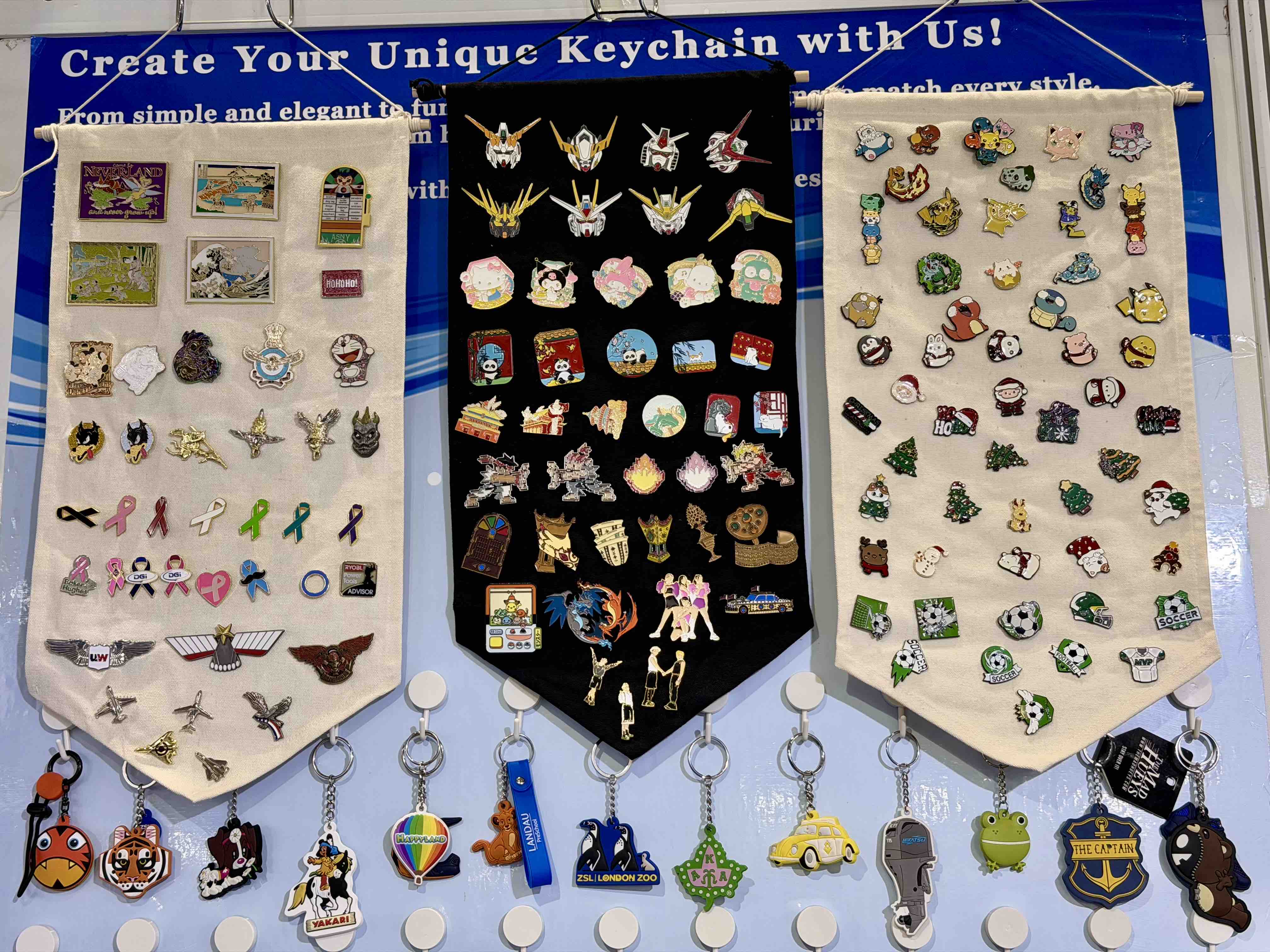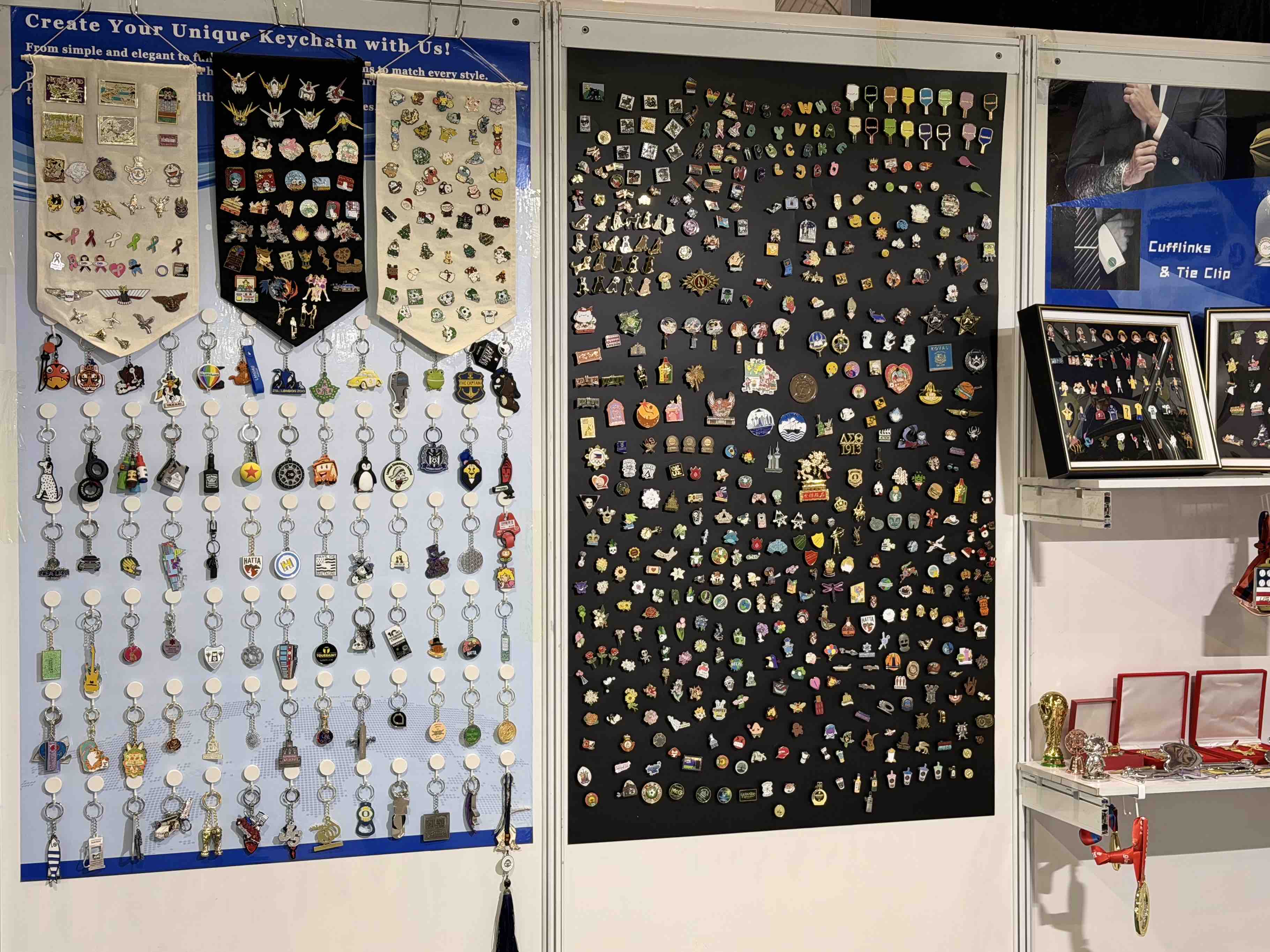 One entire wall of the booth featured a structured display of keychains arranged in 6 rows and 13 columns, visually demonstrating ASNY’s broad applications and mature expertise in custom keychain production. Each piece originated from real client orders, covering decorative accessories, museum and gallery merchandise, promotional giveaways, theme park souvenirs, and corporate event memorabilia.