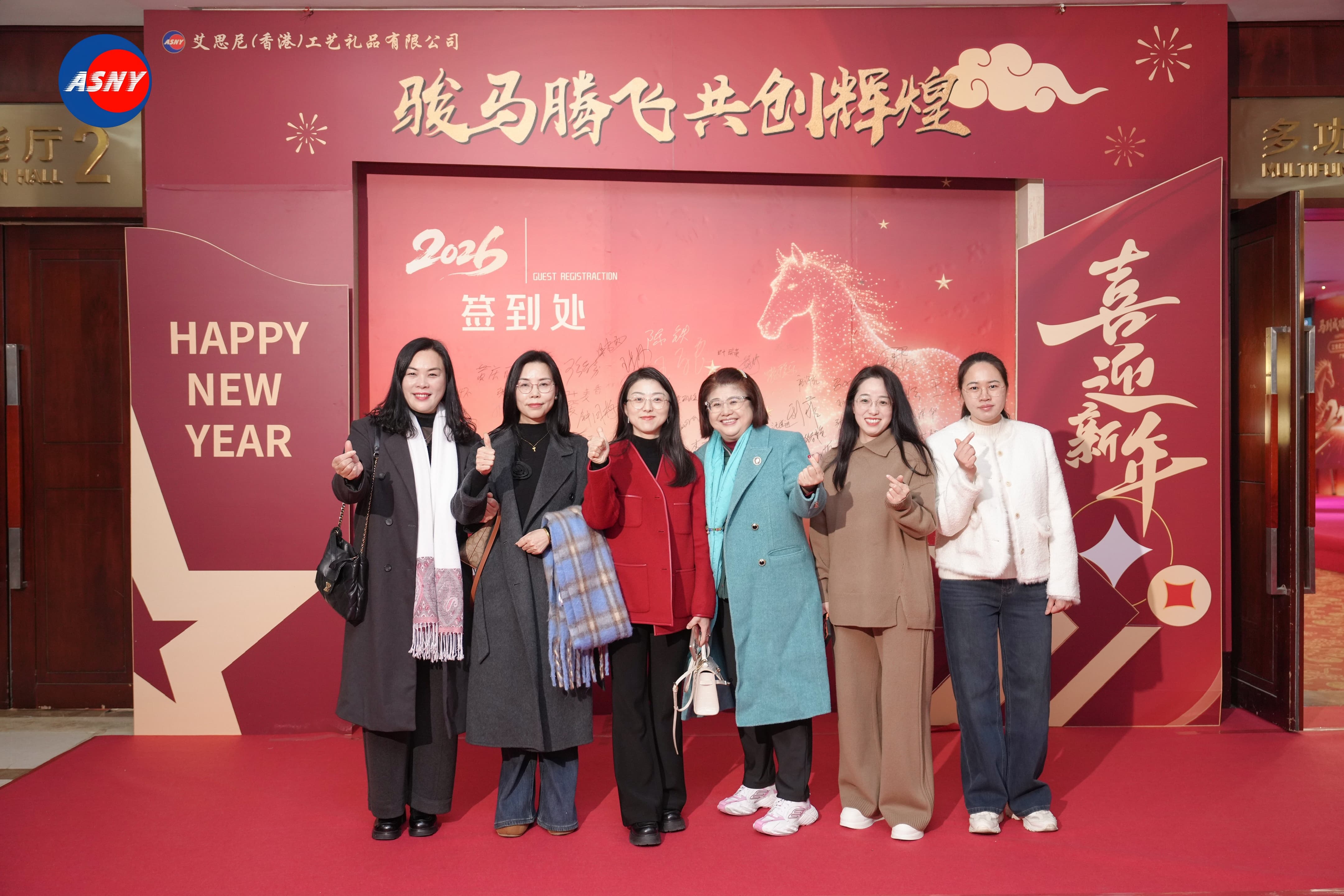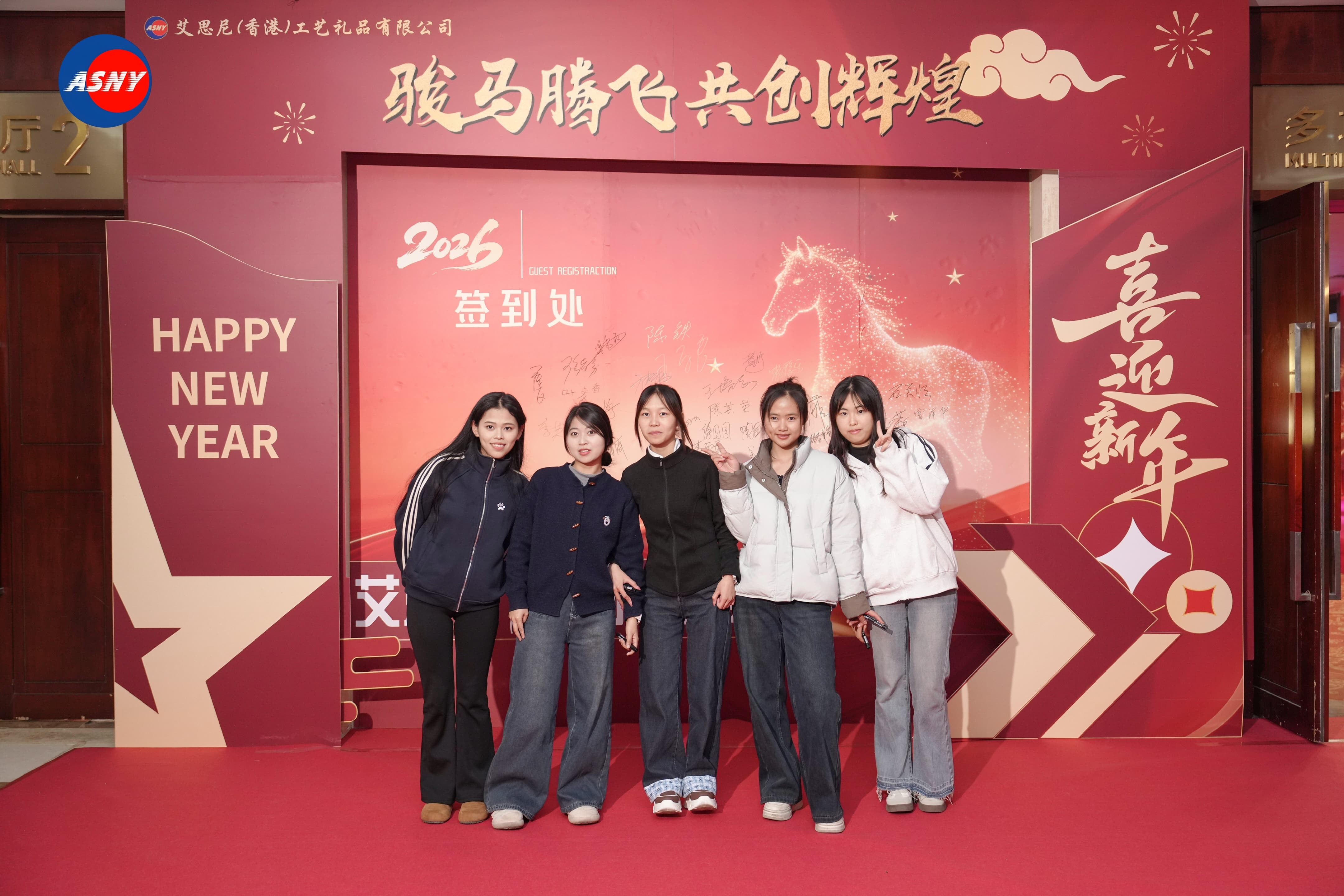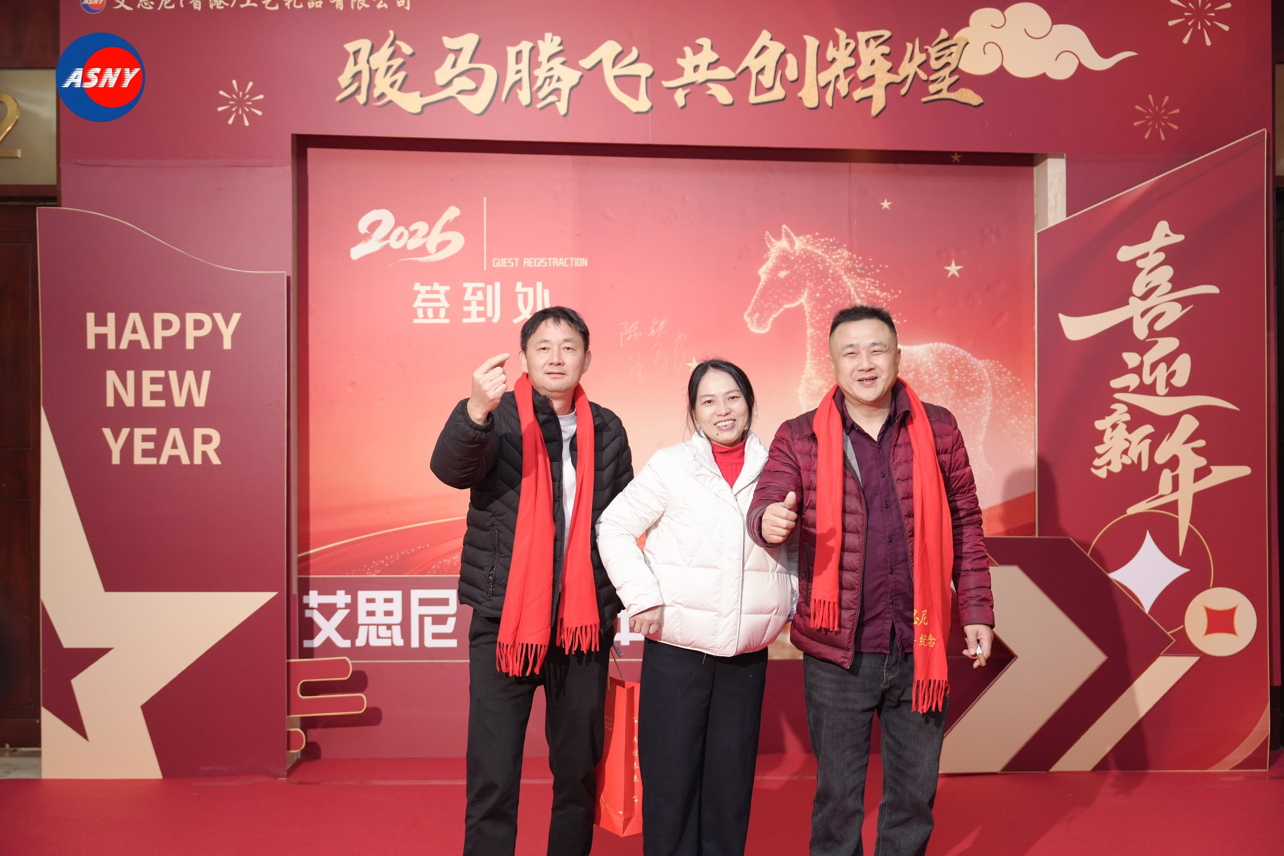 活动现场以热烈的中国红为主色调,处处洋溢着浓浓的节日气息。宴会厅入口处,一面醒目的周年庆背景墙格外吸引目光。背景设计以金色骏马为视觉核心,搭配“骏马腾飞 共创辉煌”的主题文字,寓意艾思尼在新的一年继续奋勇向前。