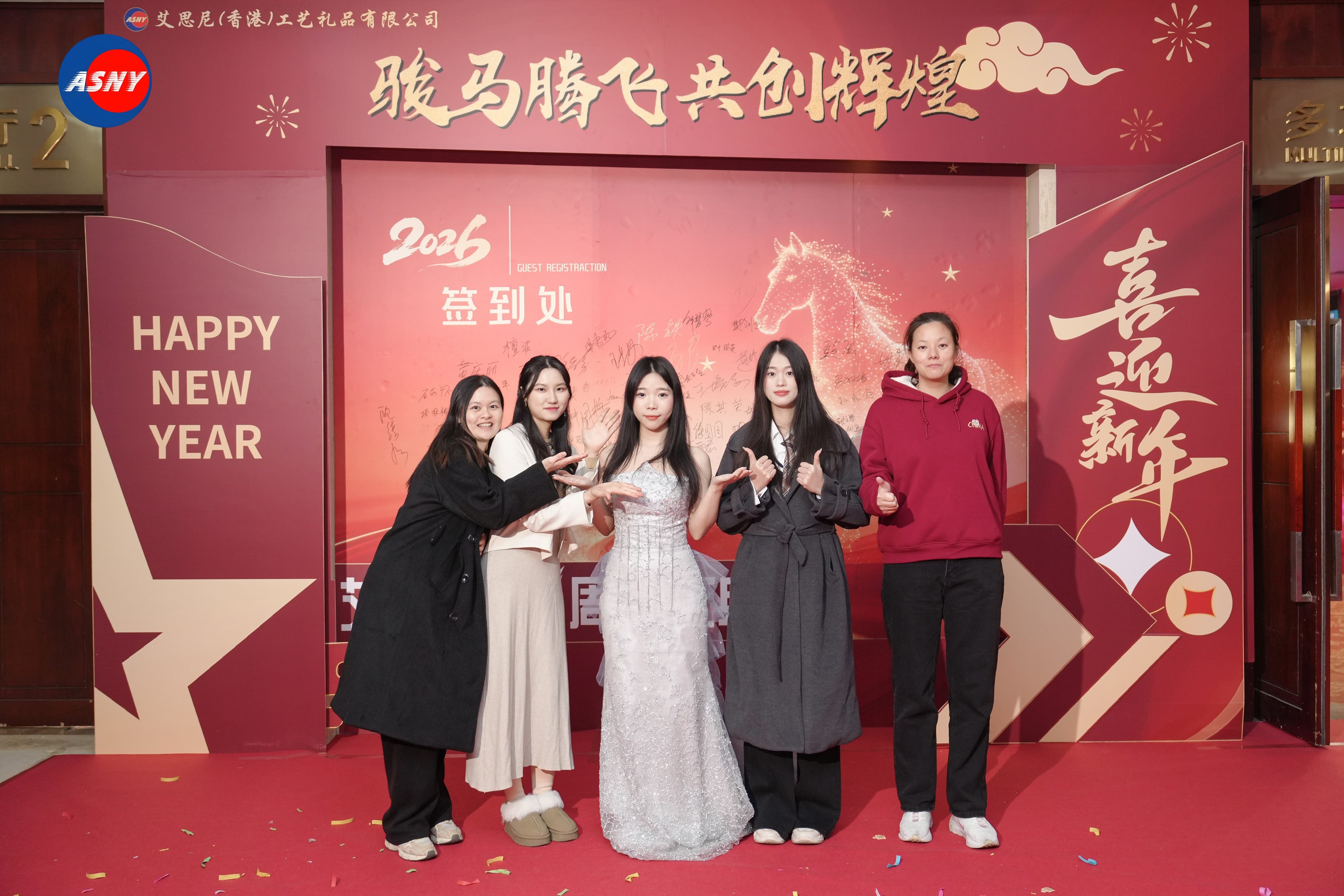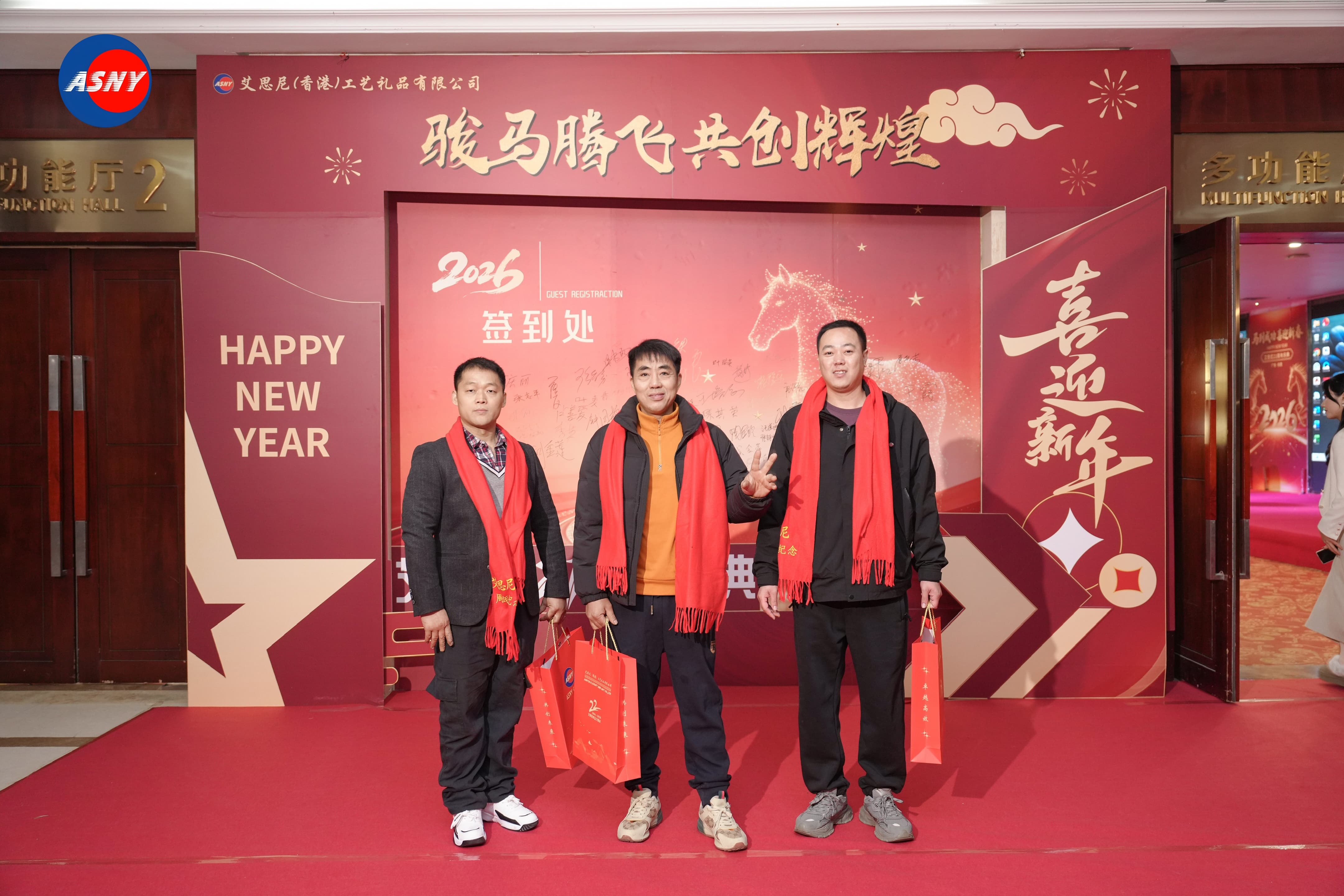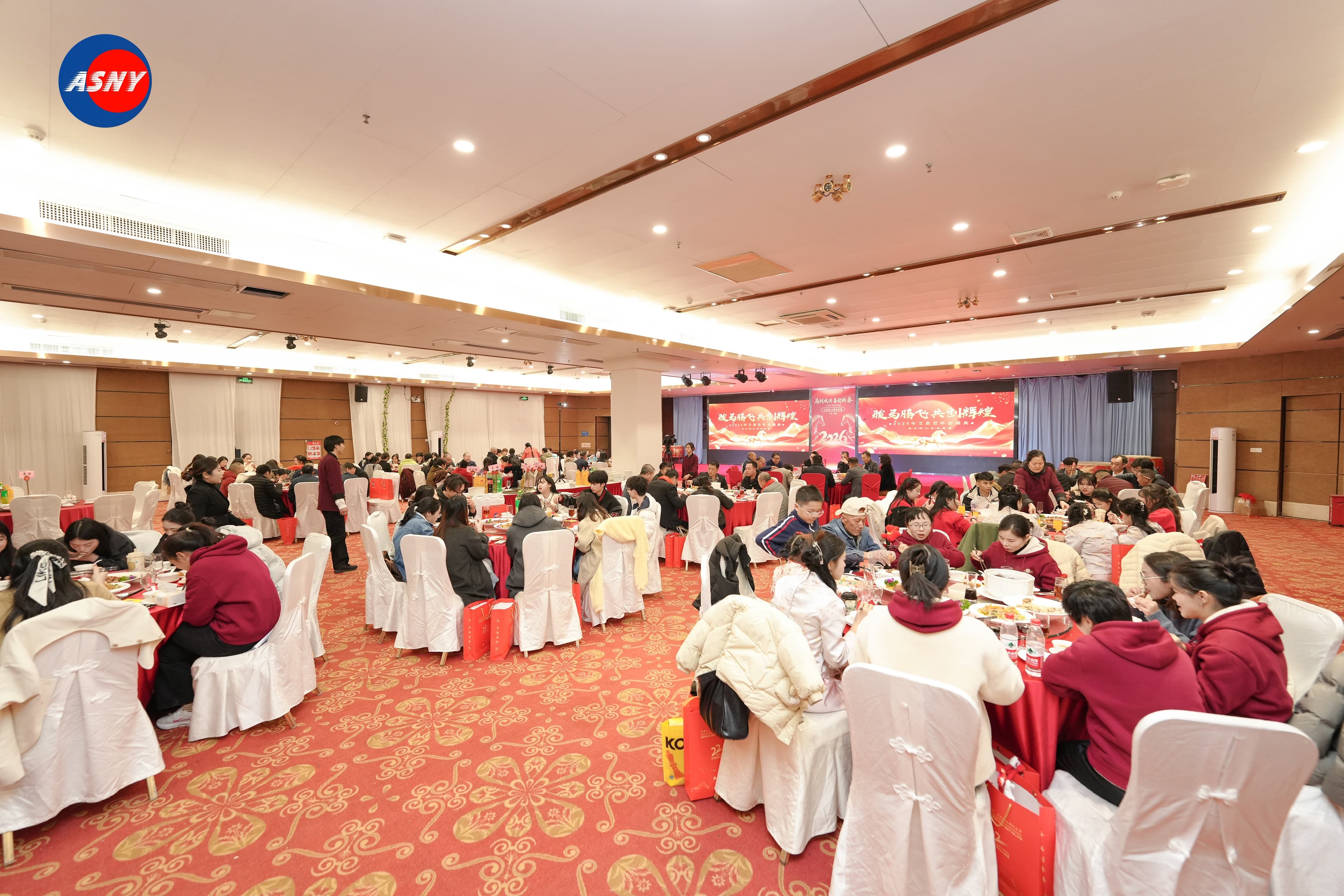 活动现场以热烈的中国红为主色调,处处洋溢着浓浓的节日气息。宴会厅入口处,一面醒目的周年庆背景墙格外吸引目光。背景设计以金色骏马为视觉核心,搭配“骏马腾飞 共创辉煌”的主题文字,寓意艾思尼在新的一年继续奋勇向前。