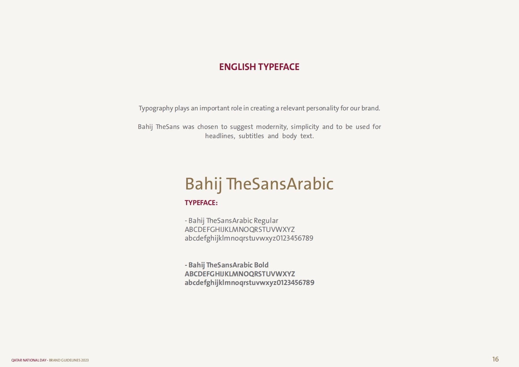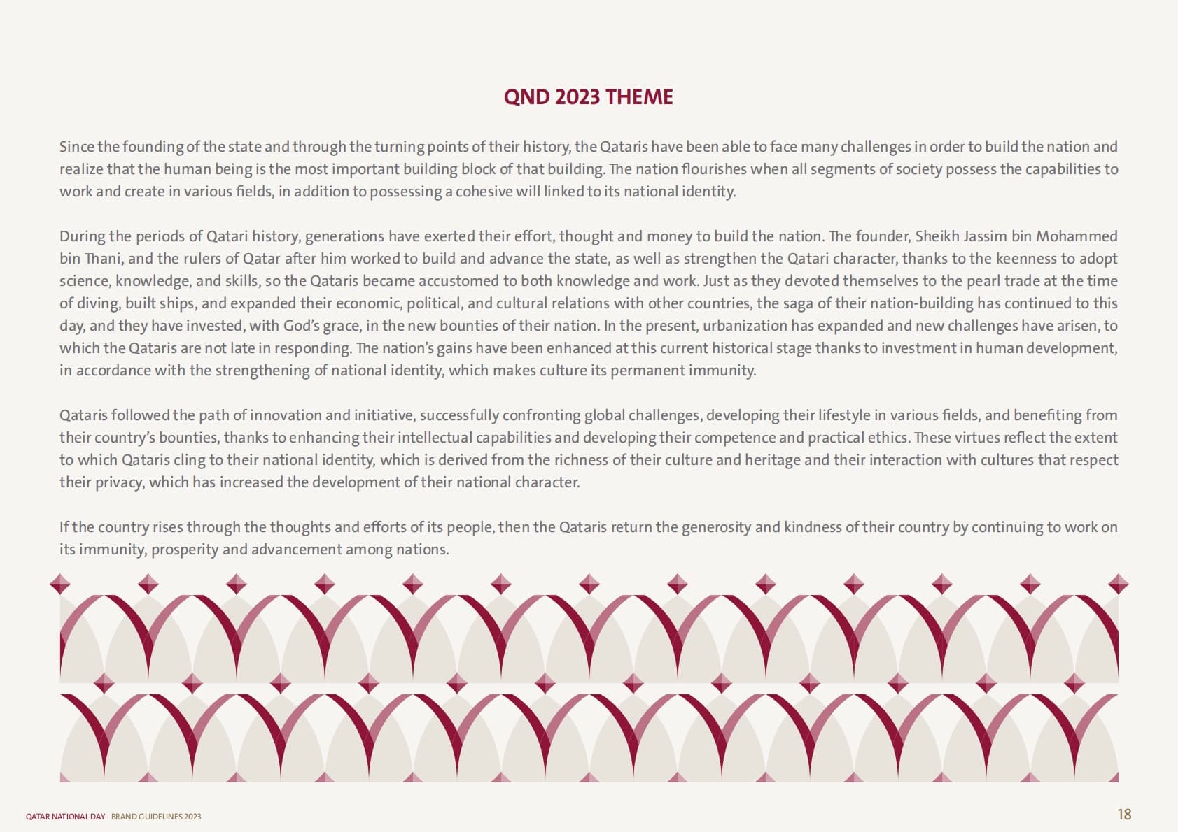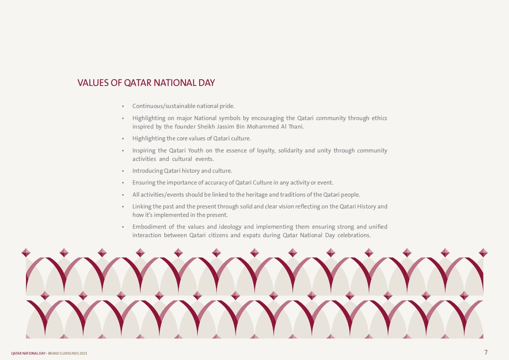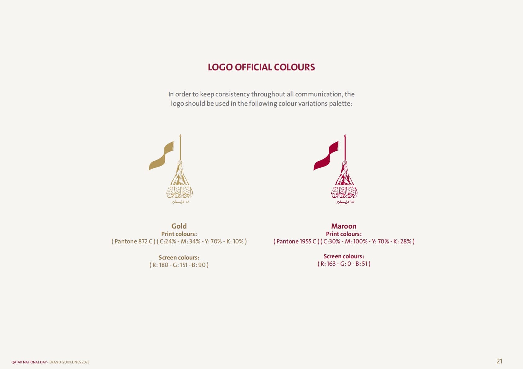 卡塔尔国庆的视觉规范由官方发布的品牌指南(Qatar National Day Brand Guidelines)统一管理。该品牌指南明确规定国庆标志、标准配色、专用字体与传统图案等核心元素,确保所有国庆传播在视觉上保持统一、权威并具有文化延续性。系统既基于国家历史符号,也采用现代设计逻辑,因此在中东地区拥有极高辨识度与完整度。